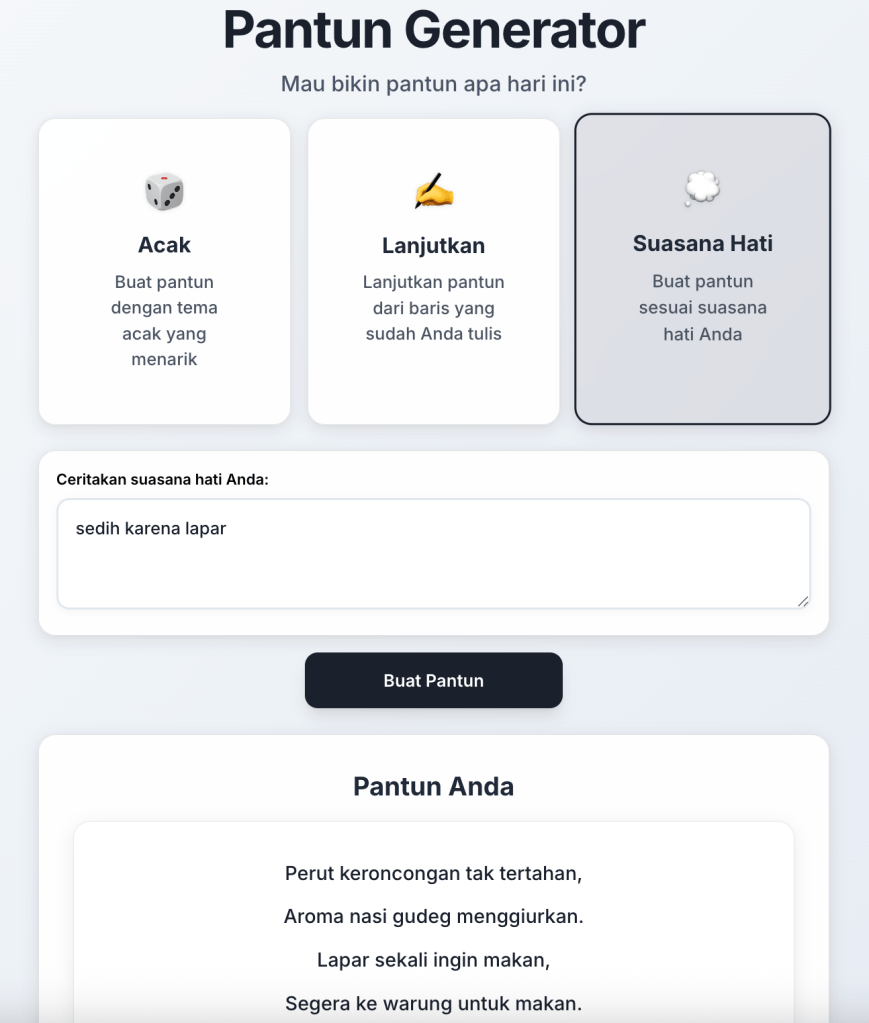 What it does: You pick a mood, write the first phrases, or just wing it, then we generate a Pantun for you