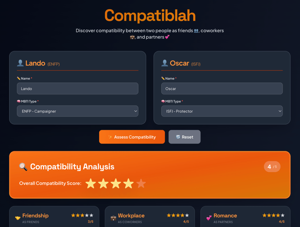 What it does: We tell you how compatible you are with your buddies by inputting your name MBTI, and other optional params like DISC/SNS/zodiac (whatever lol)